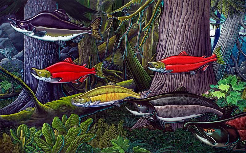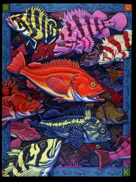 This series of small colored pencil drawings depicts how marine life responds to changes in ocean conditions. Using different shades of color, green for high ocean productivity, and blue for low ocean productivity, viewers can see the different species that flourish in one regime over another. The artwork was commissioned by NOAA Fisheries for a mural project designed specifically for the Southwest Fisheries Science Center in Pacific Grove, California. The drawings were displayed in a an exhibit at the Pacific Grove Museum of Natural History in 2011.