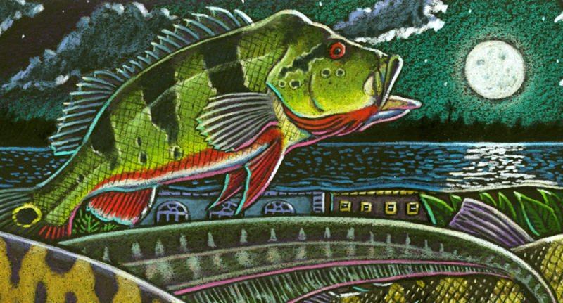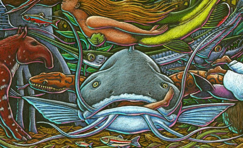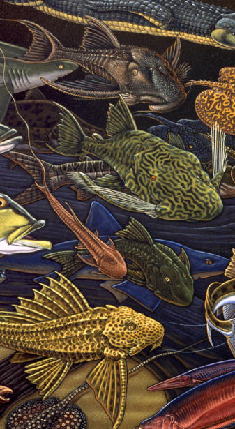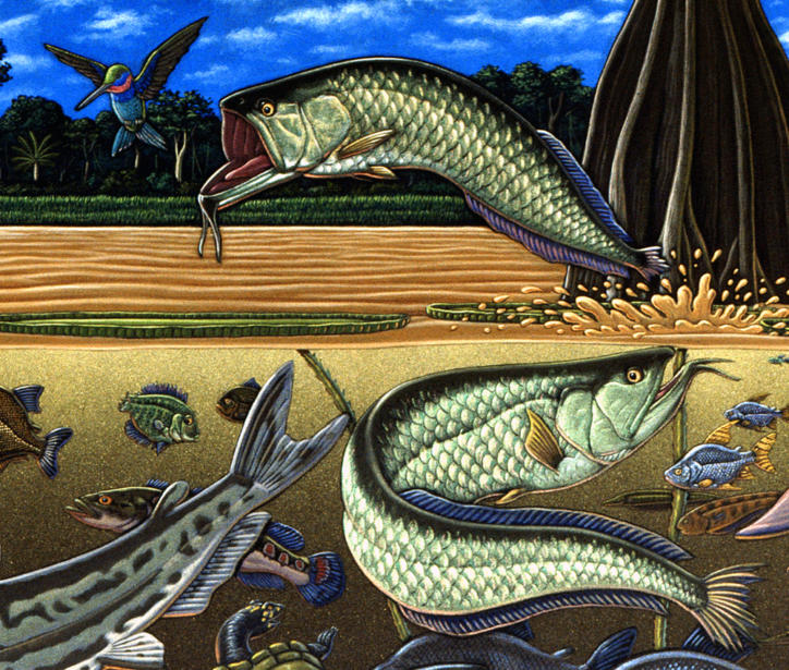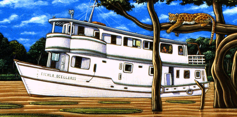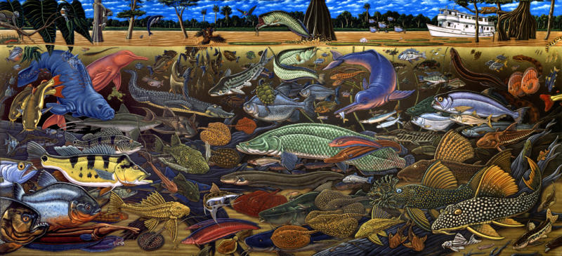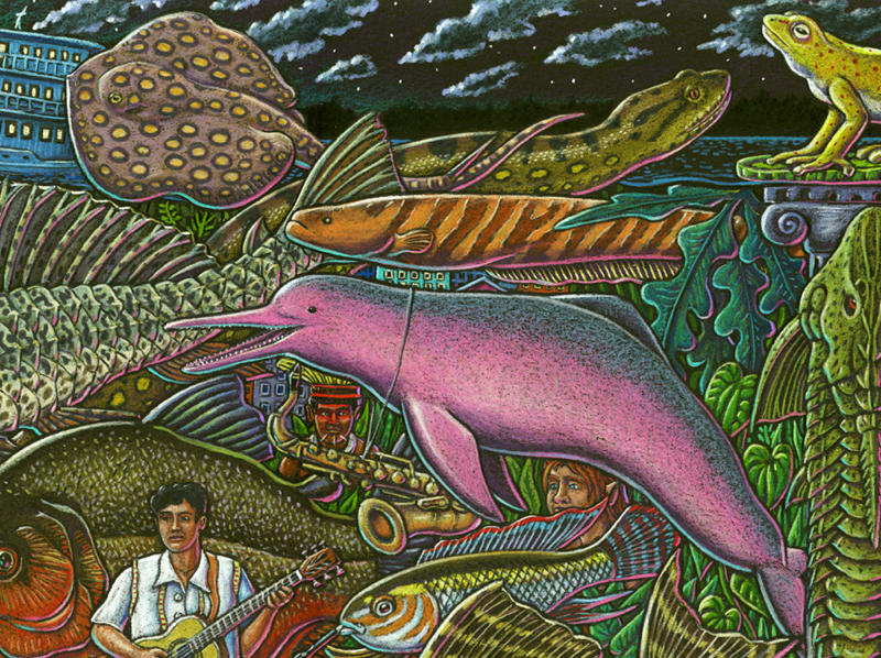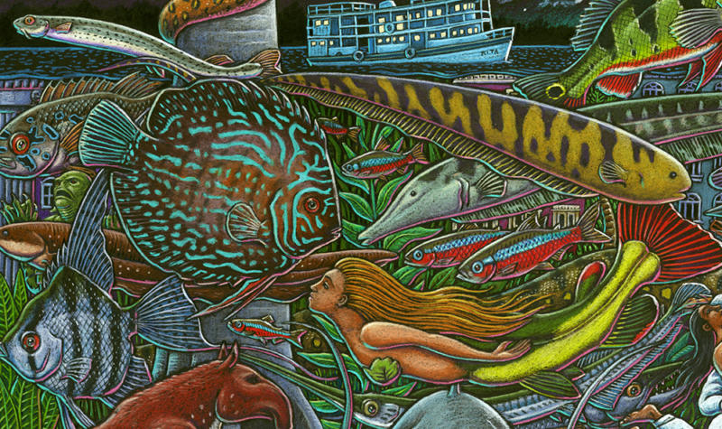I made my first trip down to the Amazon river region in Brazil in 1997 and was so inspired I painted a 7 by 15 foot fish-filled mural when I returned home to Ketchikan. That painting later graced the cover of Natural History magazine in 2001. I returned to the river three more times over the years always traveling with Moacir Fortes on his beautiful fleet of river boats. I eventually amassed a body of work that became a part of a major traveling exhibit called “Amazon Voyage: Vicious Fishes and Other Riches”. The show was masterminded by the brilliant Sean Duran, exhibits head at the Miami Science Museum. The exhibit traveled around the world for years and was eventually seen by over two million people.