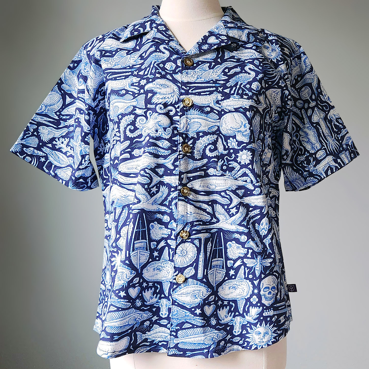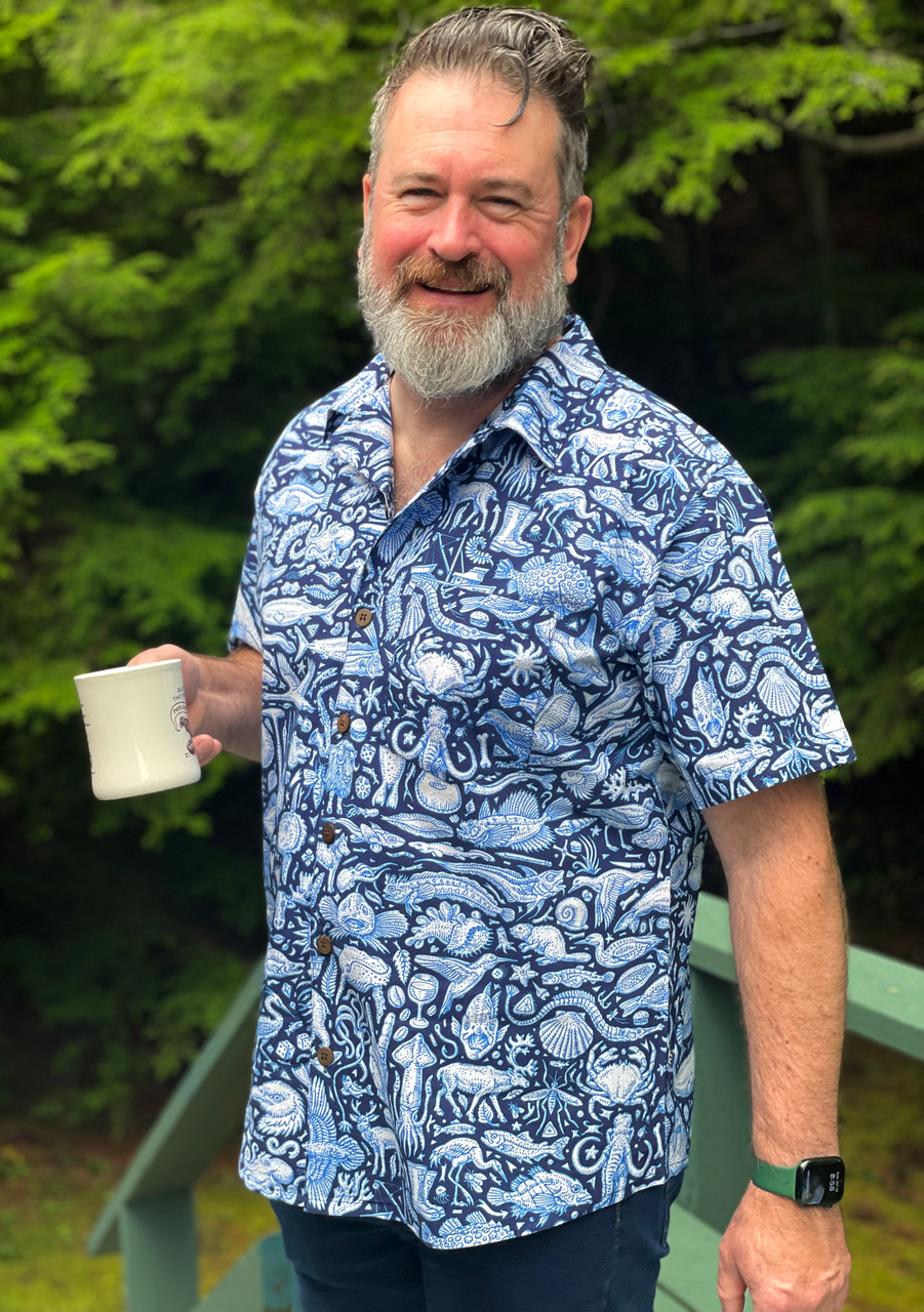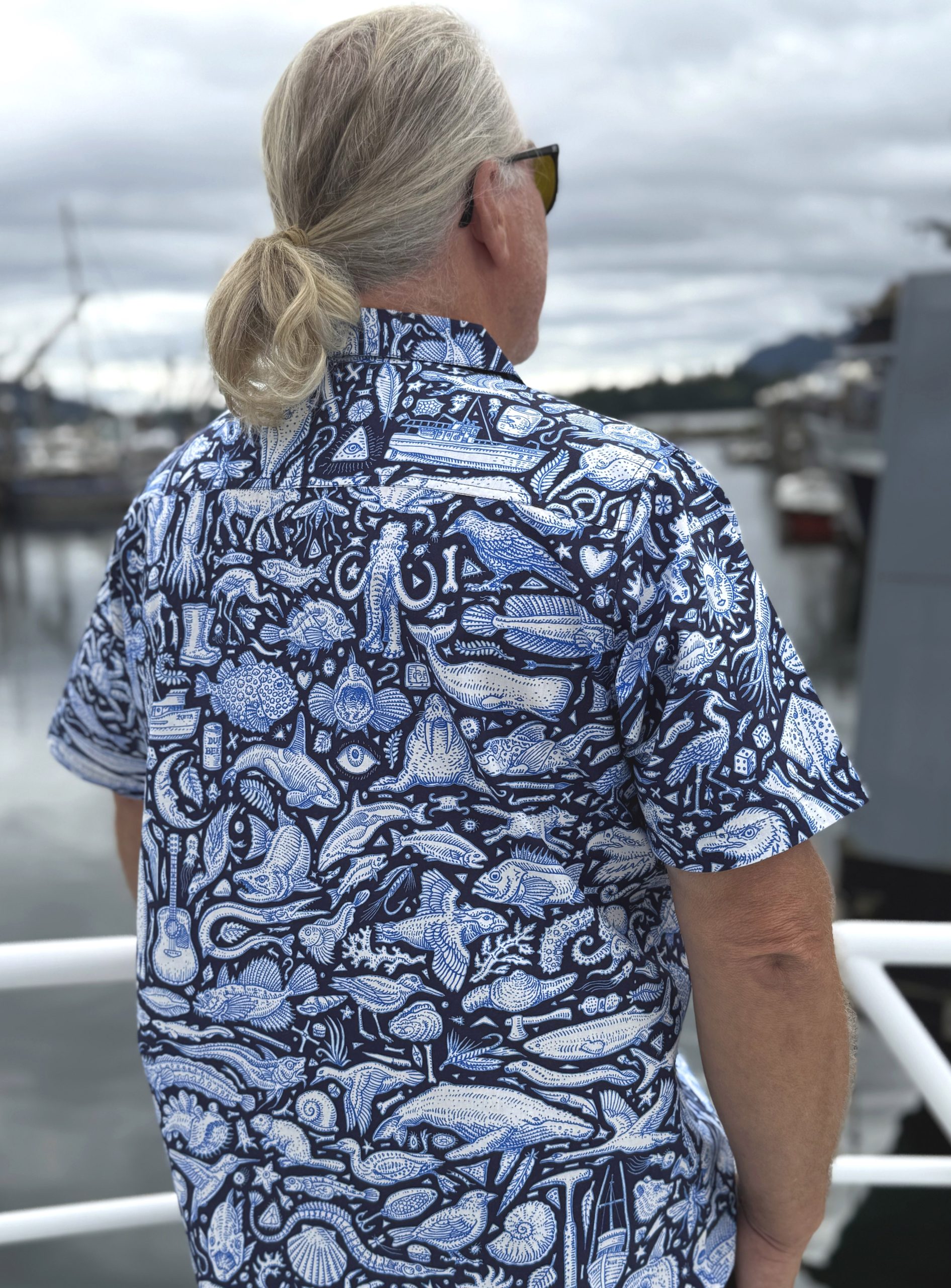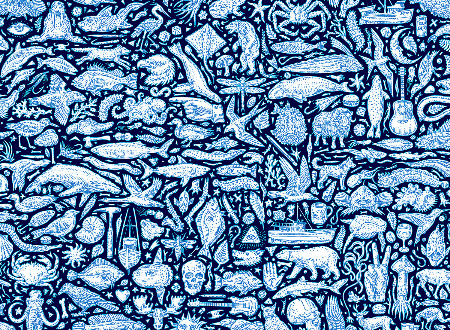 This one’s a ‘free style’ visual riff on the awe-inspiring wildlife of Alaska, along with a few ‘wilder’ images drawn from Ray’s favorite pastimes on North America’s “far out” northwest coast. As the days went by, he drew from one end of the paper to the other, riffing on whatever Alaska-oriented critter or object that fit the composition. There’s an eagle, a bear, a mammoth, a puffin, a walrus, an octopus, dice, salmon, ratfish, wine, wolves, ravens, Duff beer, halibut, fishing boats, coffee, guitars and much more. And of course, there are two cheeseburgers in the pattern.