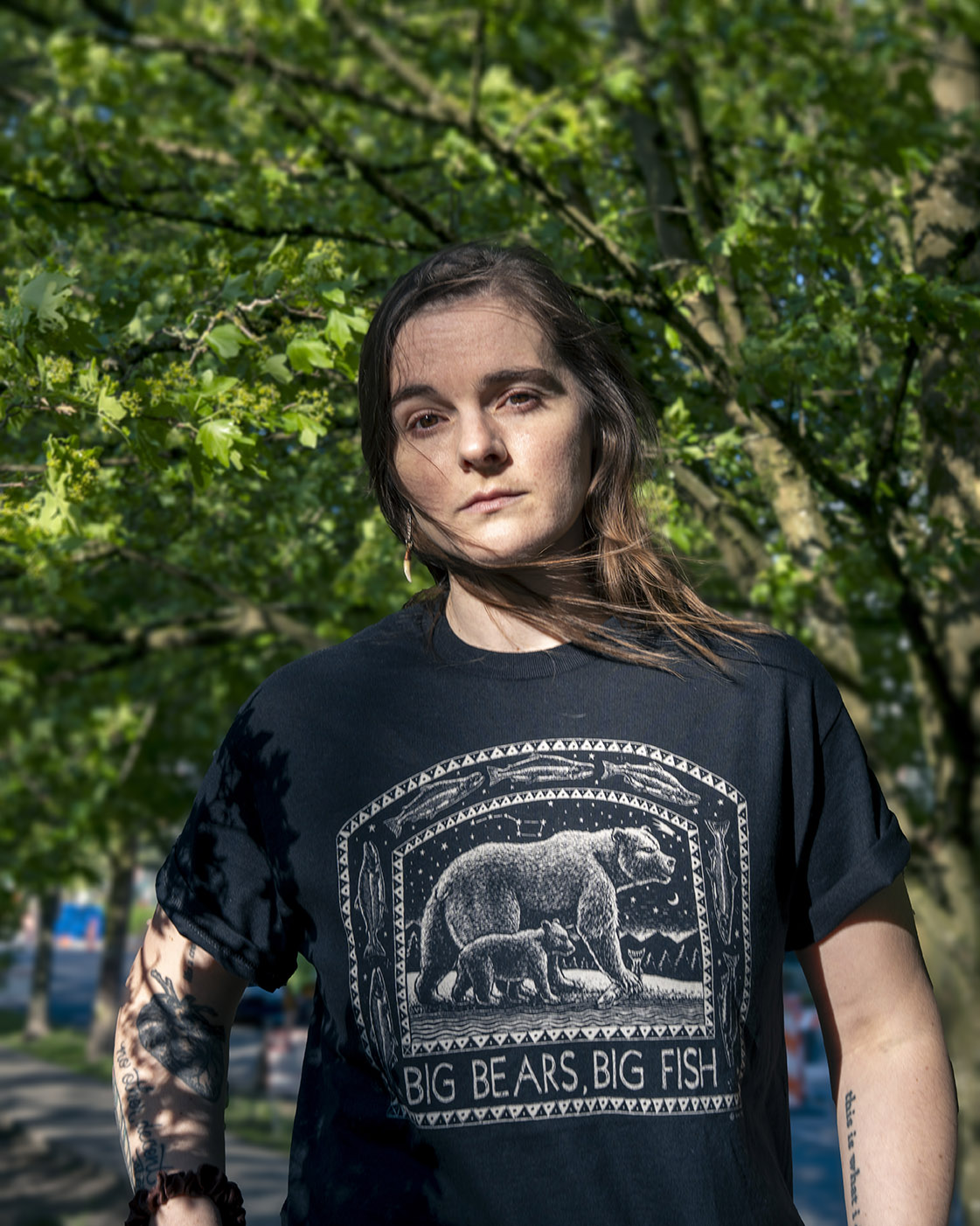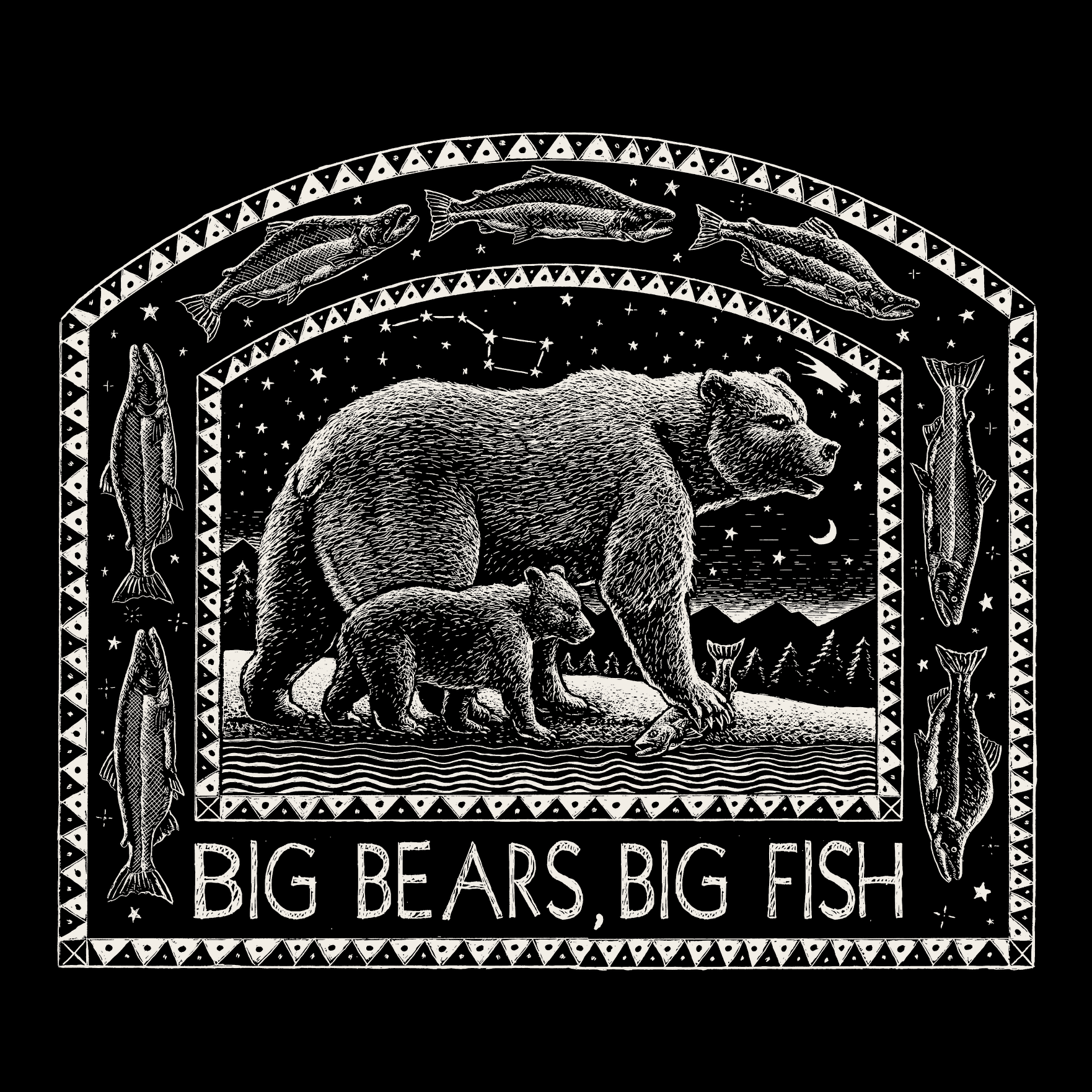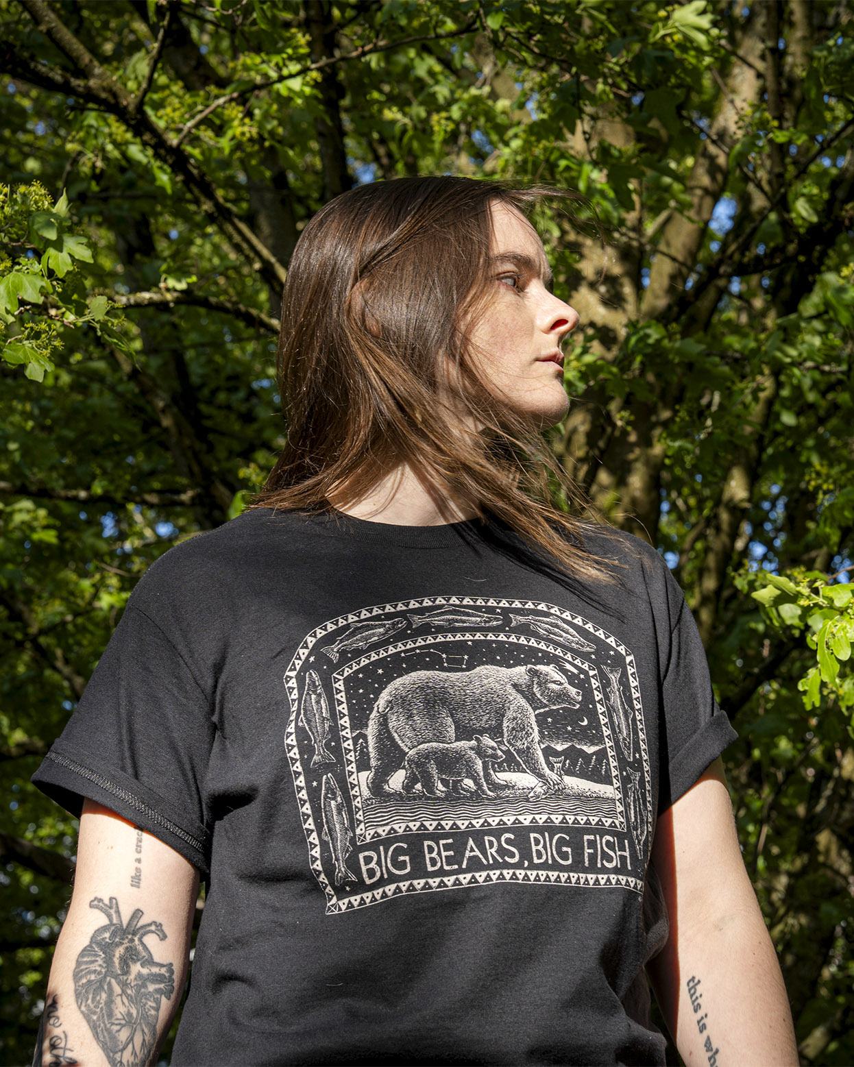 Big Bears, Big Fish has been printed using the discharge ink technique, which bleaches out the shirt dye along the delicate lines of the artwork so there’s no actual ink left on the shirt.
