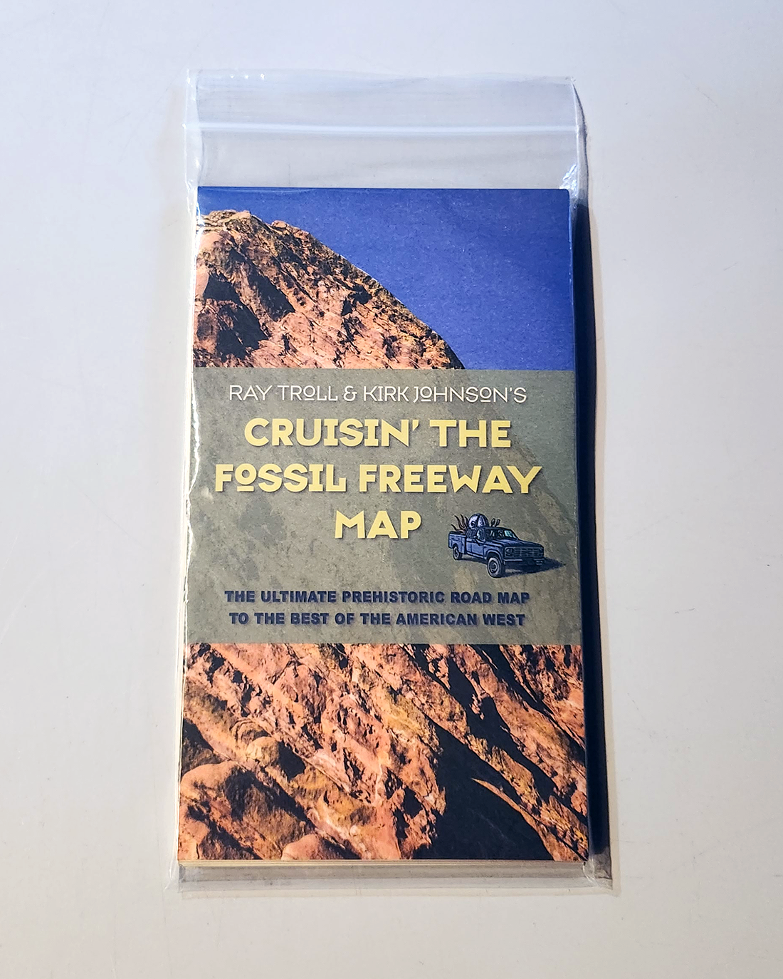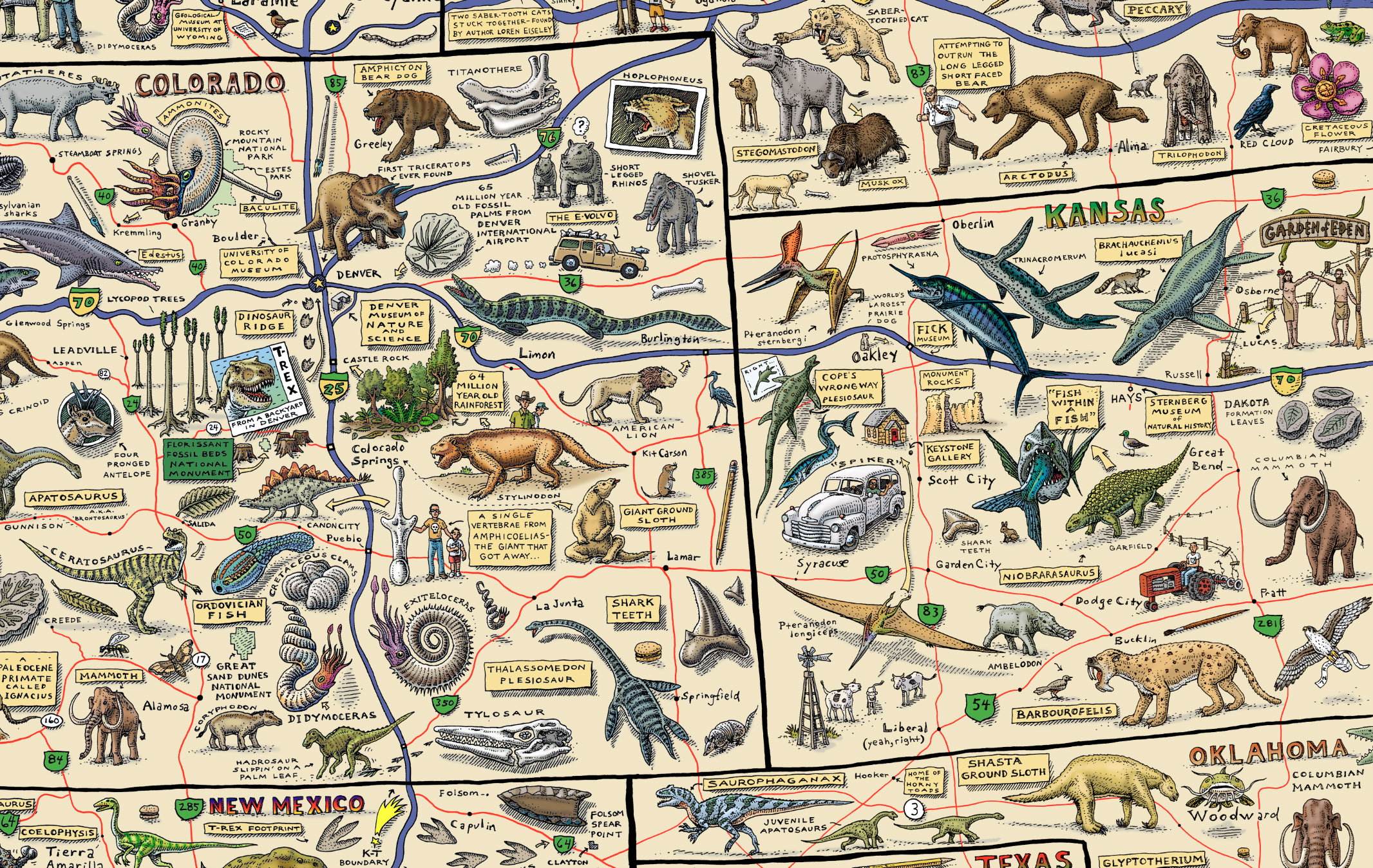 An illustrated companion map for Cruisin’ the Fossil Freeway, which follows the zany travels of paleontologist Kirk Johnson and artist Ray Troll as they drive across the American West in search of fossils. You’ll spend many happy hours perusing this insanely detailed fossil map of the American West.