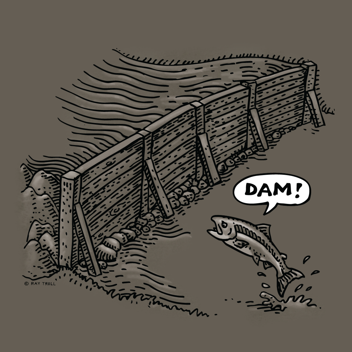 Dam! That’s the sound fish make when they hit their head. Dams can threaten salmon populations by blocking their migration routes, altering their habitat, and warming the water. Dams can also prevent salmon from migrating between the ocean and their spawning grounds. Dam removal has been a major issue throughout the Pacific Northwest. 2023 was a major milestone year for dam removal in the U.S., with the initiation of the largest dam removal project in the country on the Klamath River in California. The Elwha dam removal Washington state in 2014 in was a major step in reestablishing long lost salmon runs to the river.