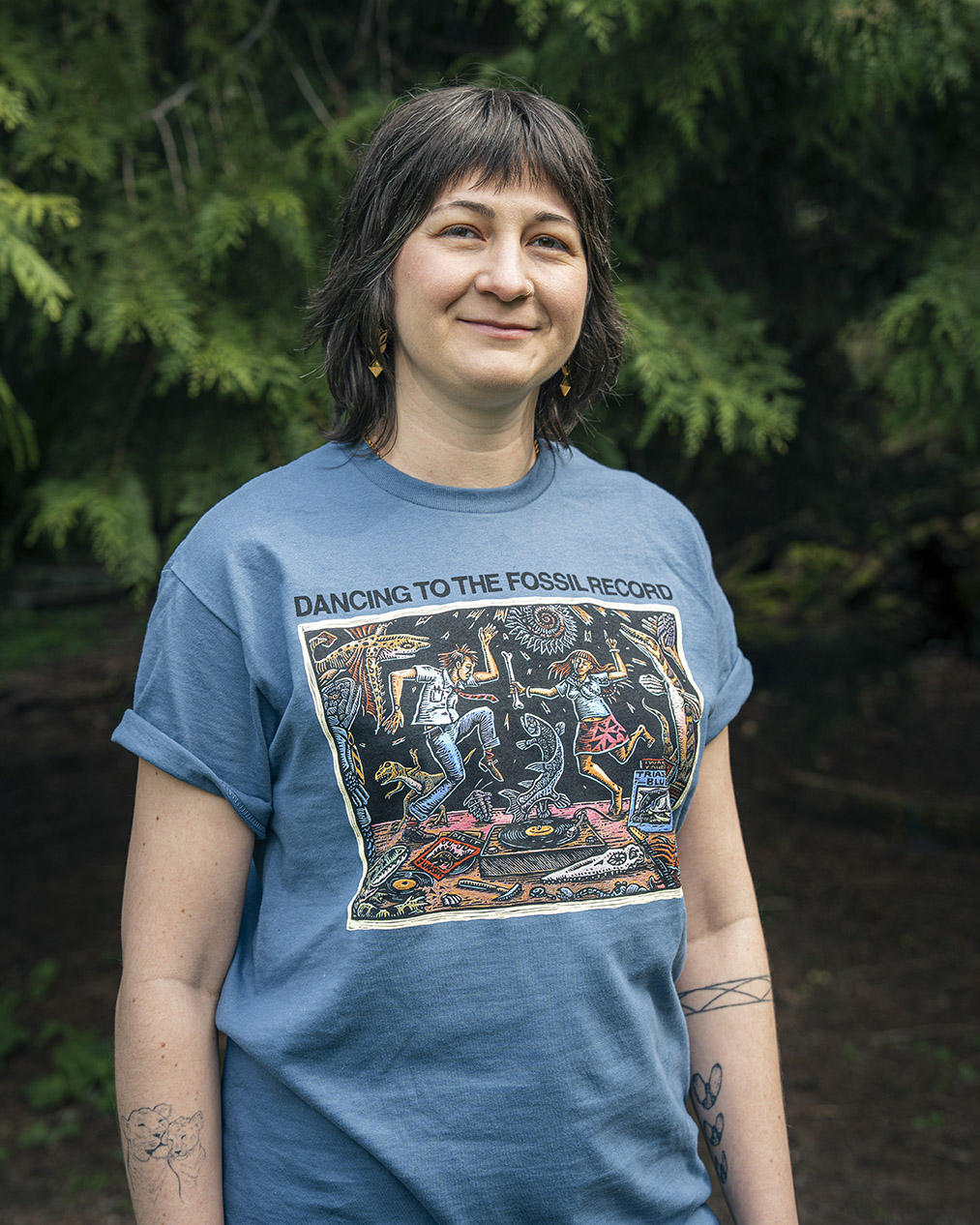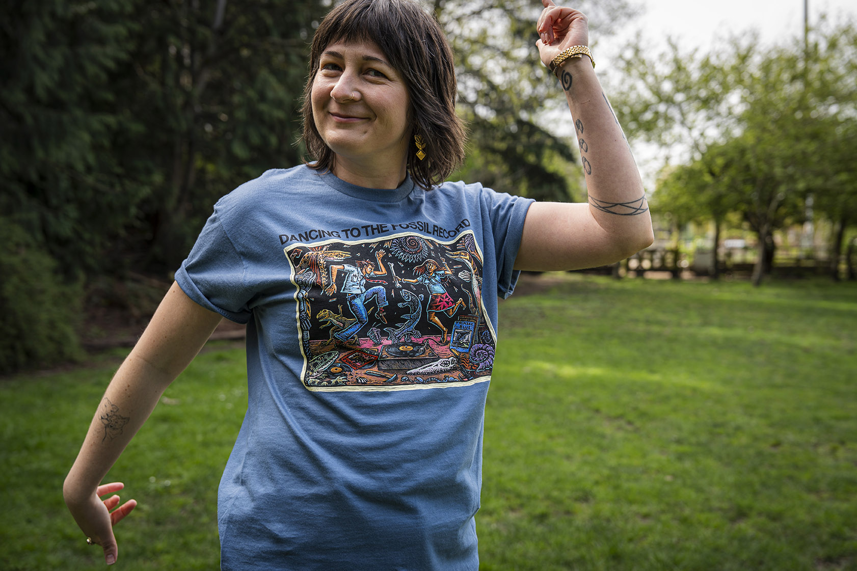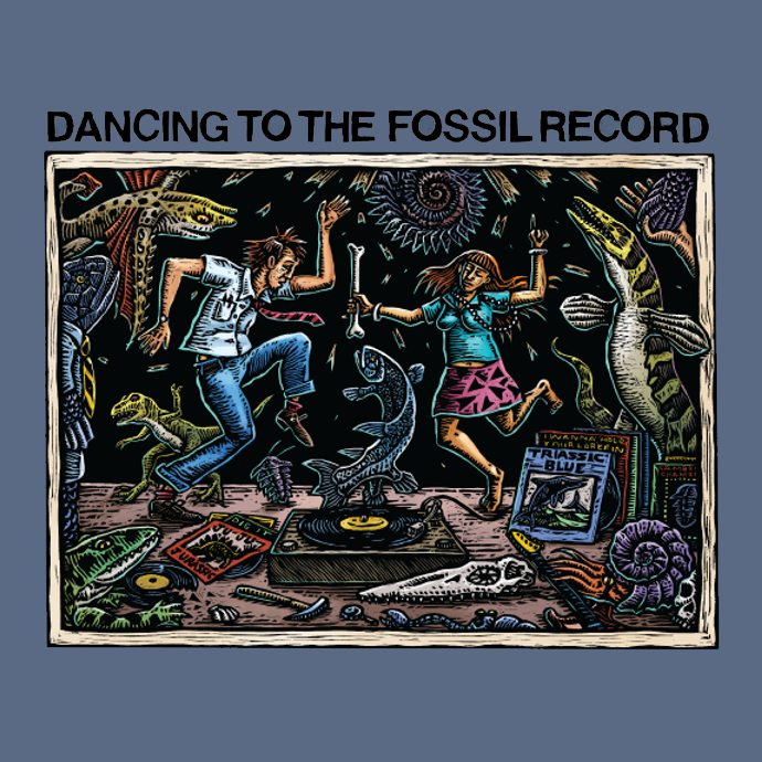 Dancing to the Fossil Record is a linoleum block print I carved and printed from back in the 90’s as part of a traveling museum exhibit and book of the same name. It depicts a modish hippy couple dancing and grooving to old vinyl albums, AKA records, surrounded by prehistoric beasties. In geologic terms the fossil record refers to the collection of all discovered fossils, arranged in chronological order, that document the history of life on Earth. The record is very old and has some huge skips in it that have eroded away over the eons, but fear not, the pulsing flow and rhythm of life is oh so easy to dance to.