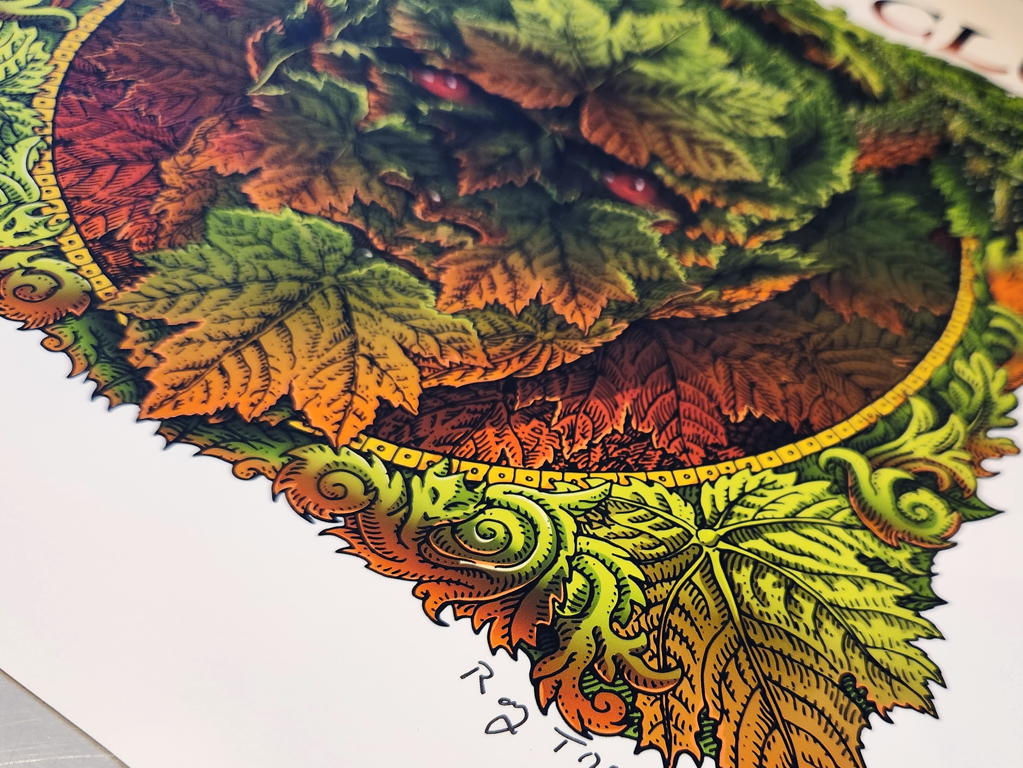 Devil’s Club (Oplopanax horridus ) is a large, thorny plant found in the rainforests of the Pacific Northwest that has been used for centuries as a traditional medicine by the Tlingit and Haida people. I’ve long been intrigued by the name and thought it might be interesting to see if I could make the “devil” appear in the details. I was also inspired by the ancient European legends of the “Greenman”, a mythical symbol of rebirth represented as a face made of leaves. It’s also the name of one of my favorite songs by the band XTC. My pal Memo Jauregui did the digital coloring.
