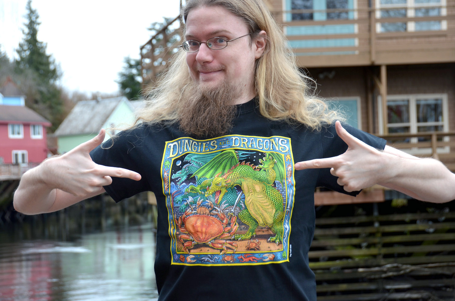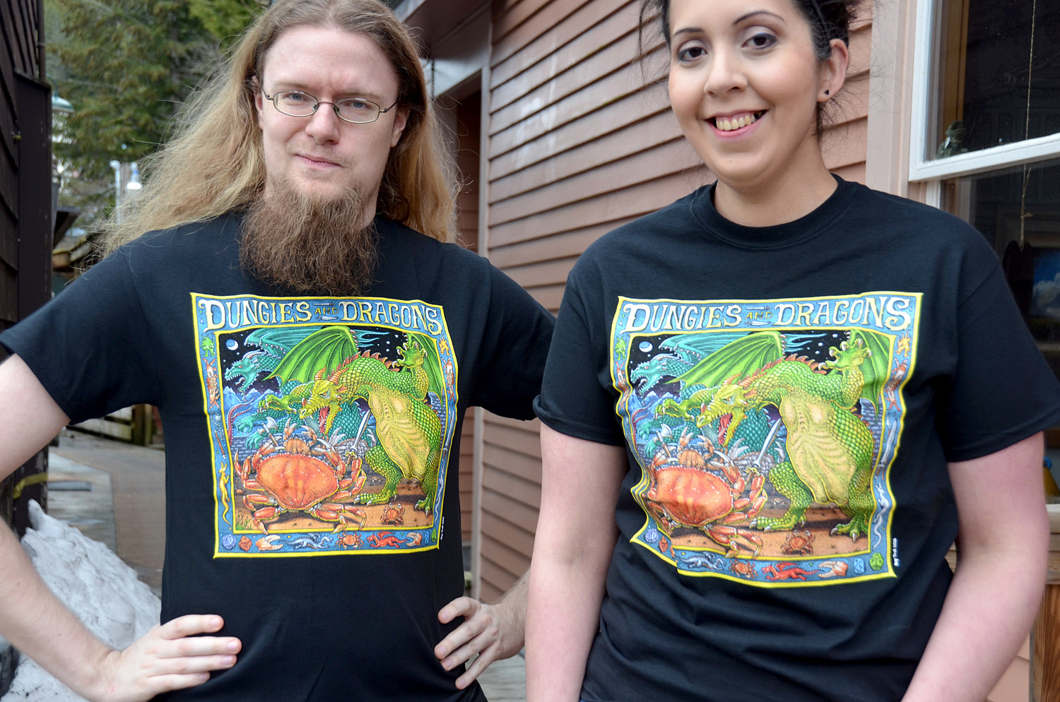 I’ve been kicking the idea of combining Dungeness Crabs and Dragons for quite some time but it never quite ‘gelled’ until I was at the legendary Burger Queen here in Ketchikan and Devon Klose casually said, as he handed me a bacon cheeseburger, “Hey Ray, you should do a Dungies and Dragons shirt sometime.” Devon nailed the phrasing just right.