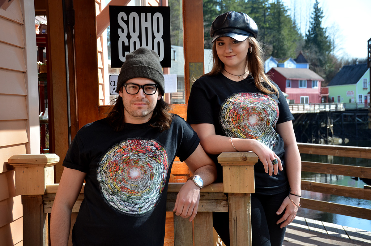 Pacific salmon have flourished along the west coast of North America for millions of years, co-evolving with the landscapes they are born and die in, during the course of their lives. With the never-ending spread of industrial civilization, habitat loss, ocean acidification and global warming their very survival has been seriously threatened. The hopeful message behind this T-shirt image is that if we take care of the salmon they will continue to feed and nurture us… forever.