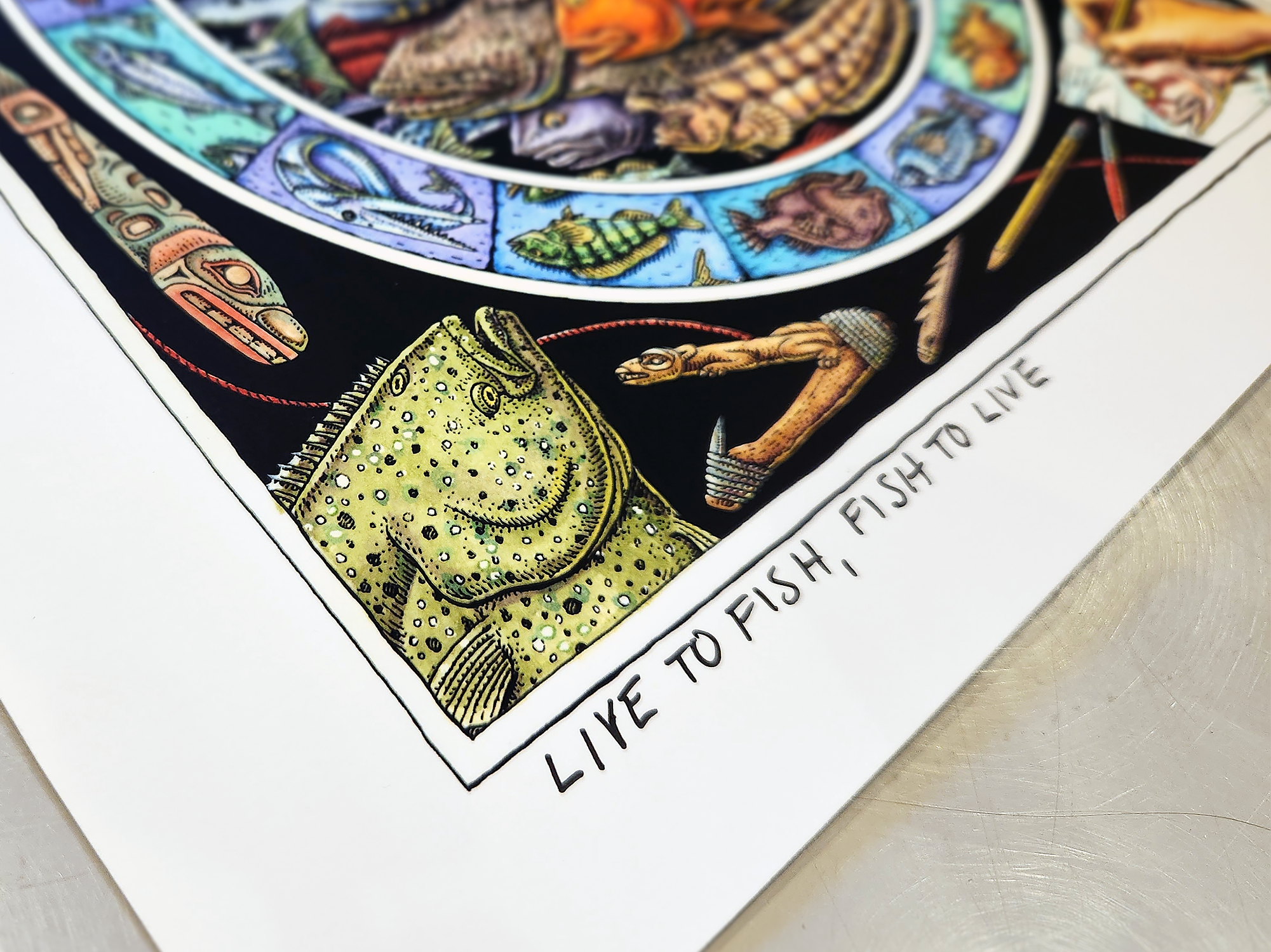 In 2005 I was commissioned to do a poster for the national American Fisheries Society annual meeting that was held in Anchorage that year. The committee asked me to show the various human uses of Alaskan fishes so you’ll notice sport fishing, commercial fishing, scientific and artistic “inspiration” and cultural/subsistence usage. The original is pen and Ink and watercolor.