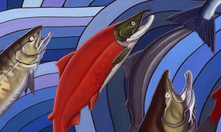I spent almost a year working on this 5 ft. x 12 ft. oil on canvas mural at a local Ketchikan elementary school, which has been reproduced in this print. The painting depicts all of the Pacific Salmon species in various color phases, Steelhead, Dolly Varden, a lone Black Bear, and a couple of Wolves against big undulating neo-Japanese-style water patterns.