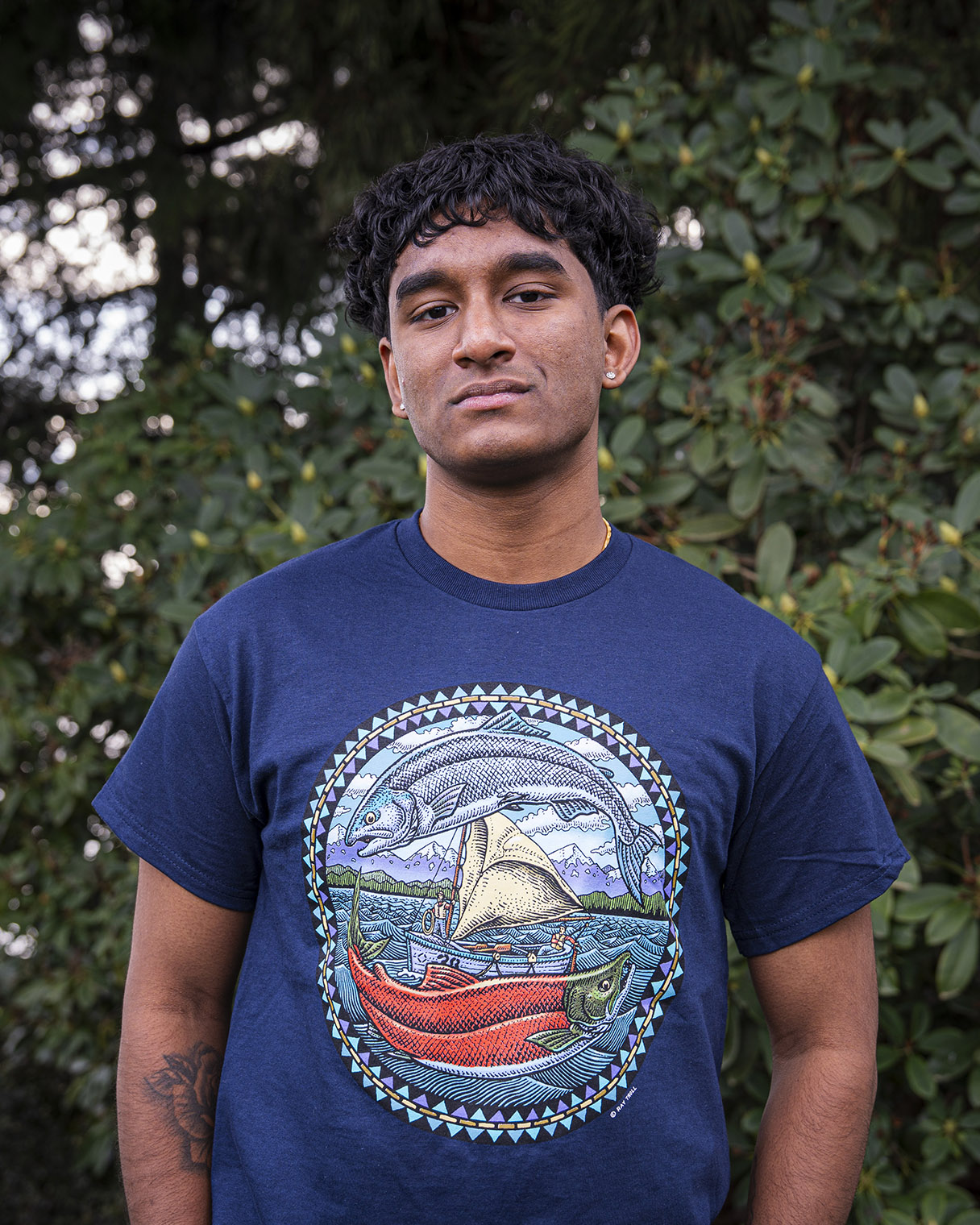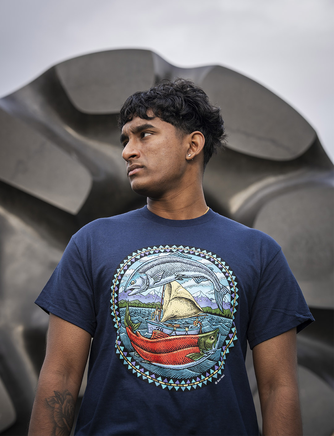Sockeye Duo depicts a dancing duo of salmon, one in its bright saltwater phase and one in the bright red spawning colors of their freshwater phase. Behind them is a classic Bristol Bay double ender fishing boat, making its way through the cold, choppy seas of the North Pacific.