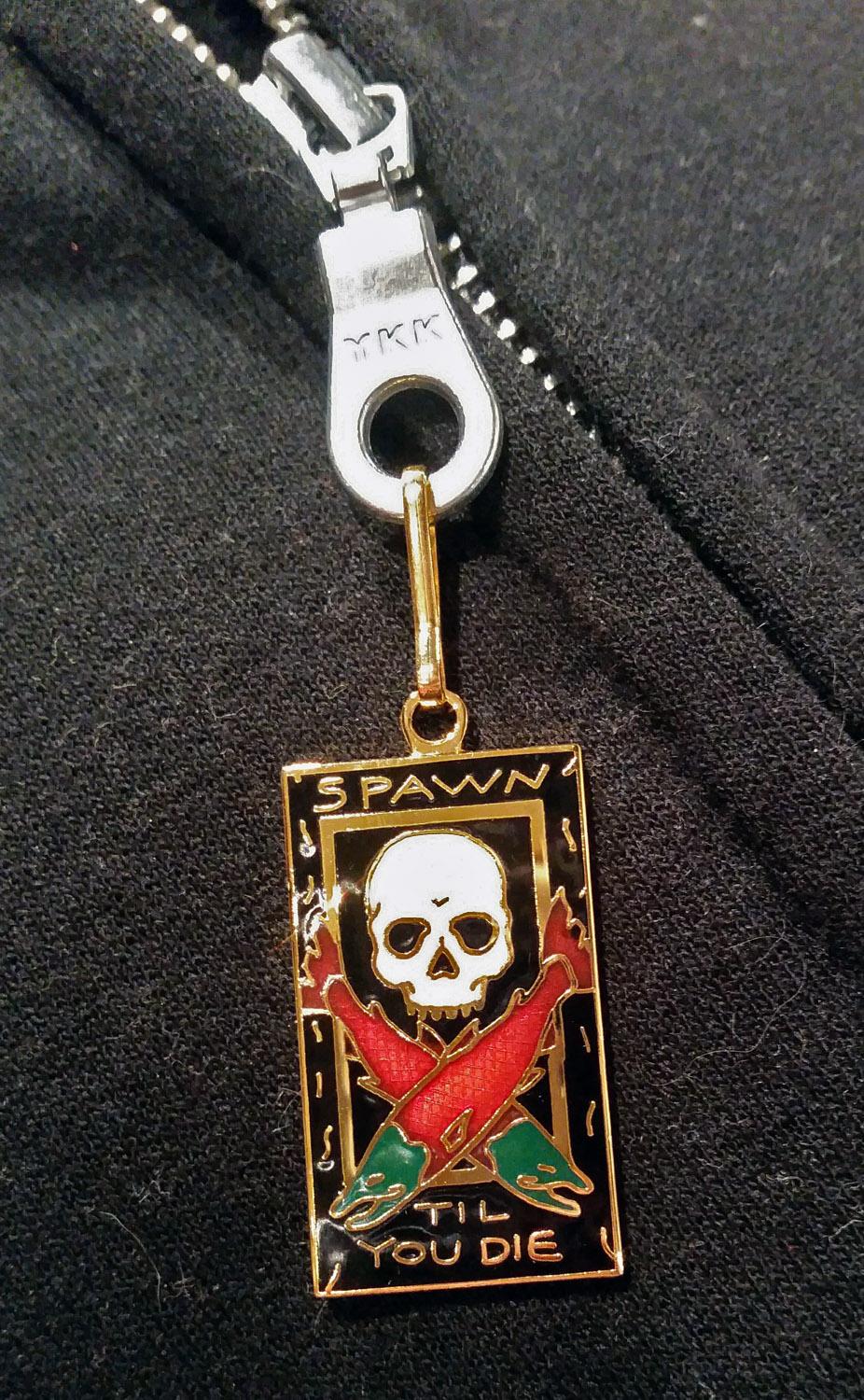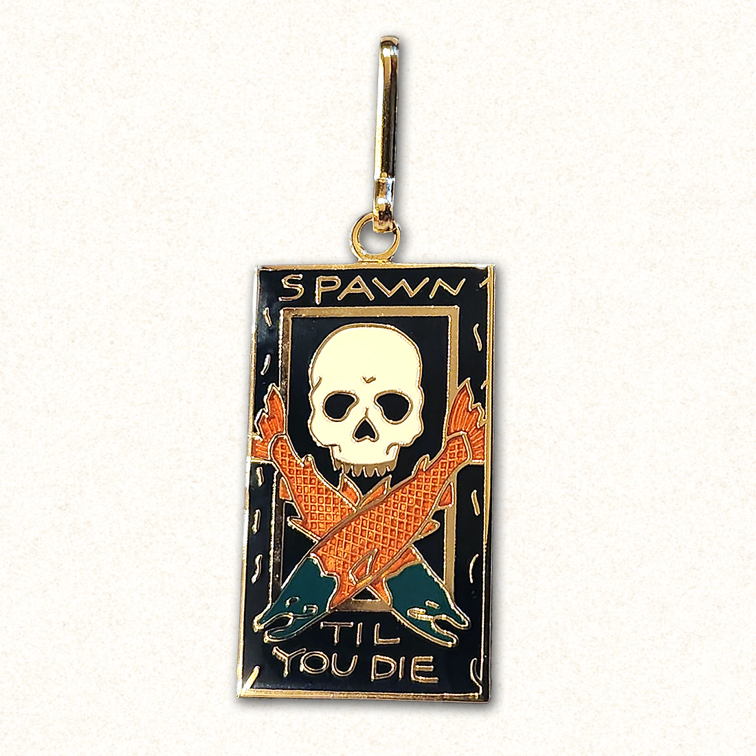 Ray Troll’s design on a beautifully enameled, hand-crafted zipper pull manufactured by William Spear Design of Juneau, Alaska. The metal is copper that has been electroplated with gold.