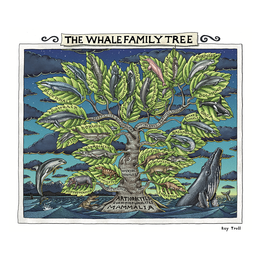 The link between them is a group of animals known as the Anthracotheres that gave rise to the Ambulocetids, or “walking whales” 50 million years ago. Since the early 1990’s extraordinary fossils of these weird looking transitional animals have been found in Pakistan and India. Whales diversified rapidly over the next 15 million years. Their front limbs evolved into fins and their hind limbs eventually disappeared altogether although small pelvic bones can still be found in living whales.