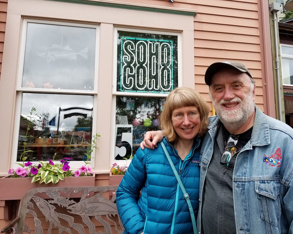 Ray and Michelle Troll opened the Soho Coho art gallery in 1992. It was appropriately situated above a salmon spawning stream in K-town’s notorious former red light district. The Star Building was the biggest house-of-ill-repute on the street and featured a hardwood dance floor with a large inlaid star. The original star is still there today! Once upon a time it housed a rowdy dance hall run by the likes of “sporting women” known as Black Mary and Thelma Baker. It went on to showcase the artwork of Ketchikan artists Ray Troll, Evon Zerbetz, Chip Porter, Hall Anderson, Grace Freeman, and more. The Soho Coho was the place to find an eclectic mix of originals, prints, t-shirts, books, fossils, and unique gifts. Our motto is “Better living through difficult art!”